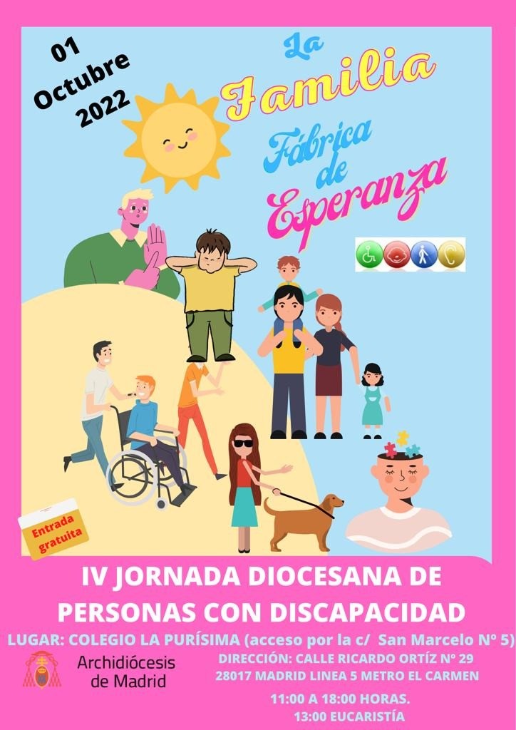 El día 1 de octubre: Tendrá lugar en el Colegio La Purísima, situado en la calle Ricardo Ortiz, 29, cerca del metro de El Carmen. A parte de a los discapacitados se invita también a sus familiares. Comenzará con la acogida a los participantes. Luego se celebrará la eucaristía. A continuación será la comida. Y en la sobremesa varias personas darán testimonio de sus experiencias como personas con discapacidad. Toda la info e inscripción (gratuita) en https://www.pastoralsocialmadrid.com/iv-jor-dioc-de-personas-con-discapacidad/
